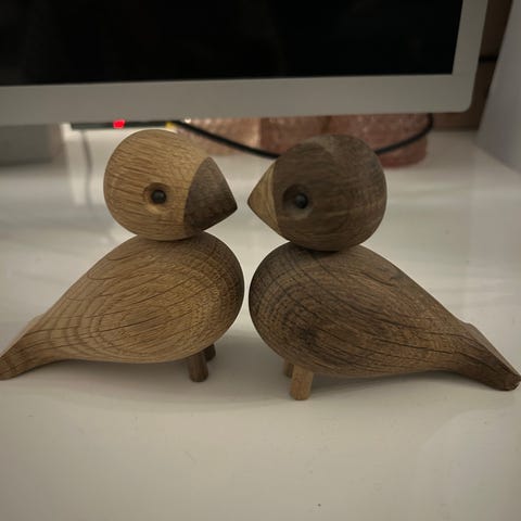 Turtelduer fugle fra Kay Bojesen i grå og sort, de har aldrig været pakket ud og har derfor ingen skader. Fuglene kan ikke længere købes i denne kombination, så det kan ses som en limtied edition og derfor en højere pris.