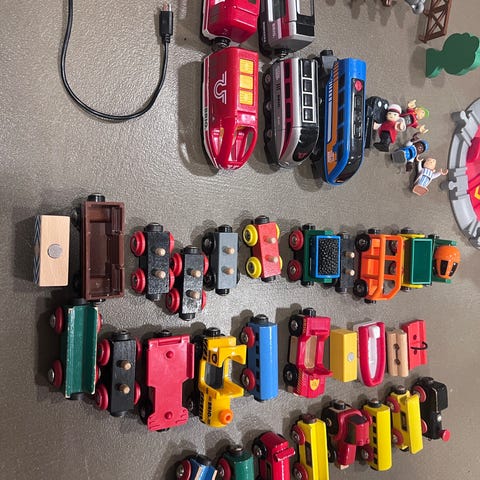 Meget flot og velholdt BRIO legetogssæt i træ med forskellige tog, vogne, skinner, bygninger, figurer og tilbehør - fra røgfrit hjem.