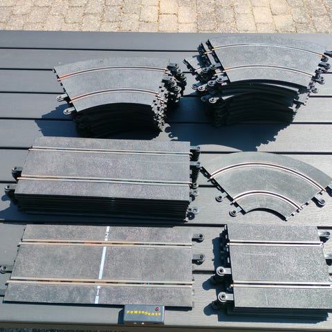 SCALEXTRIC bilbane med diverse tilbehør, 18 stk buet, og 15 stk lige skinner, samt 2 Stk håndtag og omgangstæller.