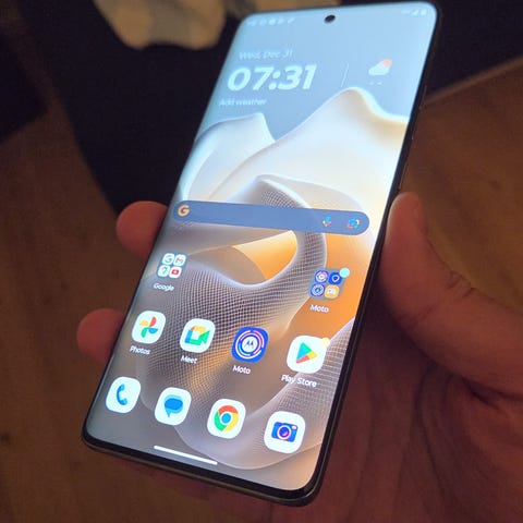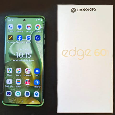 Motorola smartphone med 512 GB hukommelse. Enheden har et kamera med fire linser og leveres med et blåt beskyttelsescover samt oplader med kabel.