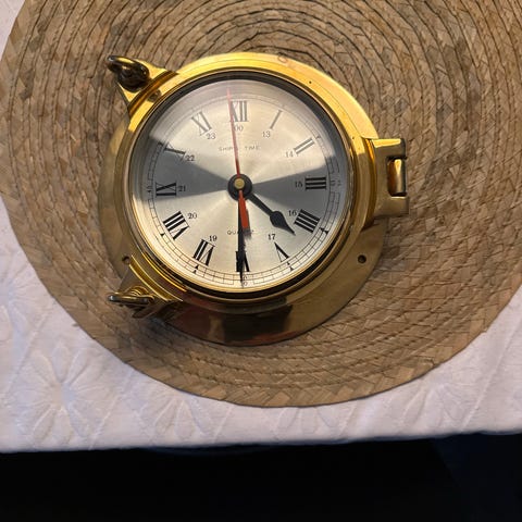 Klassisk dansk skibsur der kan slå glas (det kan slås fra). Quartz-værk med stort C batteri, så der skal skiftes batteri meget sjældentHar været opsat i båd, trænger til polering, men er fint. Bud er velkomne.
