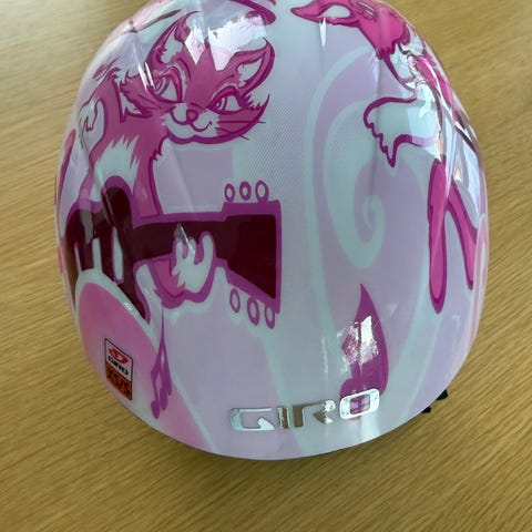 Giro cykelhjelm i hvid farve med flere ventilationsåbninger. Hjelmen er designet til at beskytte hovedet under cykling og har justerbare stropper for bedre pasform.
