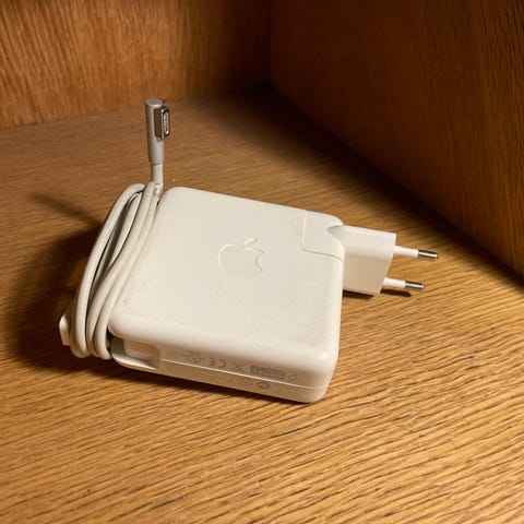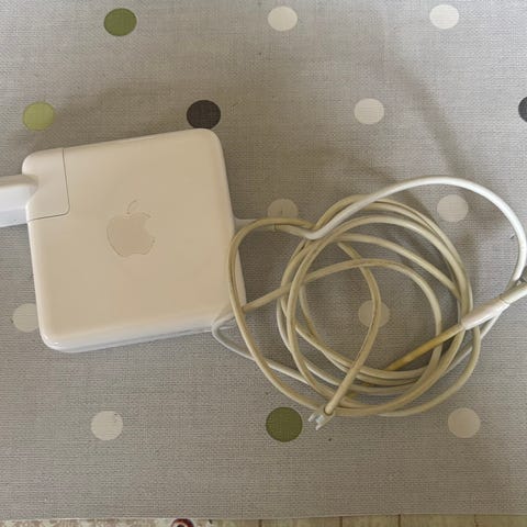 Original Apple MagSafe 2010 strømforsyning til MacBook computer. 85W. Jeg har renset og “lukket” selve kablet med hvis isolerings-tape som var ved at gå op. Fungerer perfekt og er sikker på at levere den rigtige mængde strøm til din ældre Mac-model.