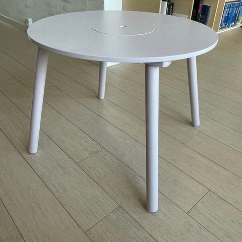 Fint lille børnebord med opbevaringsrum under bordpladen. Bordet har hvide overflader og ben i træ. Designet til børn med funktionel opbevaring til legetøj eller tegnesager. Desuden kan bordpladen vendes om og så kan den bruges til at tegne på så illustreret på billederne.