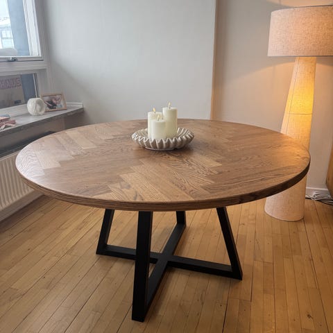 Lækkert super smukt rundt sildebens spisebord - Ø150. Det er snedker lavet og har sorte stålben. Farven på bordpladen er natureg og er plejet passet og plejet med bivoks flere gange om året.