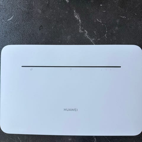 Huawei router med tilhørende strømforsyning. Enheden er designet til netværksforbindelse og har et kompakt, hvidt kabinet. Det er til Sim kort