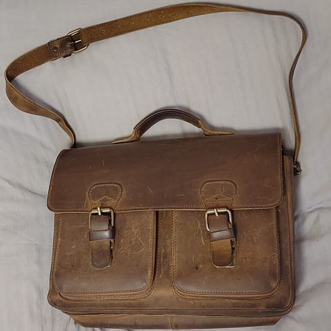 Tasken har flot patina (som kan friskes op med læderfedt, hvis man kan nænne det) og kan holde i mange år endnu, Ruitertassen-tasker er kendt for at holde i årtier.