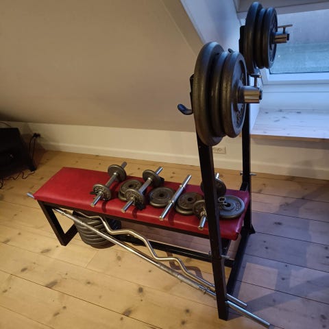 Der medfølger, stang 20kg. 2x15kg, 2x10kg og 2x5kg