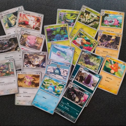 Pokémon samlekort med forskellige motiver og karakterer, herunder Ninetales, Torkoal, Houndour, Gabite, og flere.