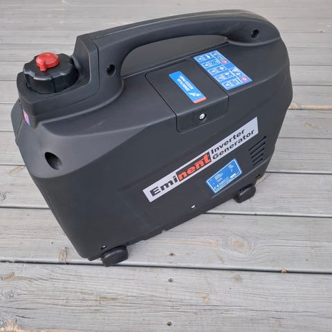 Briggs & Stratton generator med metalramme og bærehåndtag. Designet til at levere elektrisk strøm til forskellige anvendelser. Udstyret med brændstoftank med blå låg og beskyttende gitter omkring motoren.