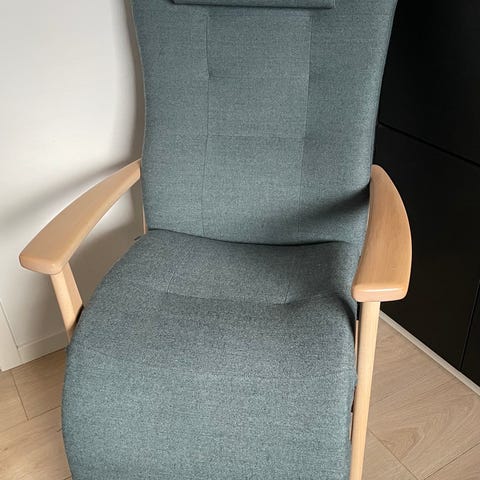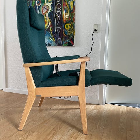 Farstrupstol med høj ryg som kan indstilles både i ryg og sæde. Elektrisk ’stå-op-hjælp’