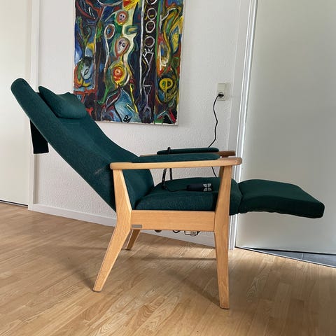 På stolens højre side sidder der en fjernbetjening. På fjernbetjeningen er der 6 knapper, som styrer stolens elektriske funktioner. Ved at trykke på én af knapperne kan du få hele stolen til at løfte sig. Det er altså både sæde, ryg og armlæn, der løfter sig på. Giver mulighed for at støtte brugeren op fra siddende stilling til stående.Ny 35.000 kr.