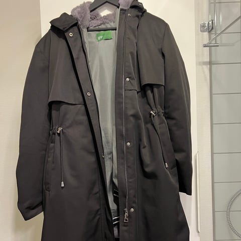 Den har snøre så den kan snørre ind for neden og i hætte.