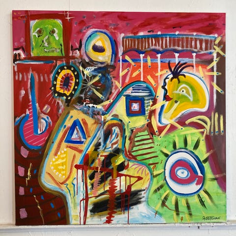 Henri Koé og Knud Damgaard som er kunstnerne bag Abstrhak indgik gennem et par år et samarbejde, hvor de gensidigt inspirerede hinanden og sammen skabte omkring 40 værker fulde af god energi, glade farver og ofte finurlige detaljer.