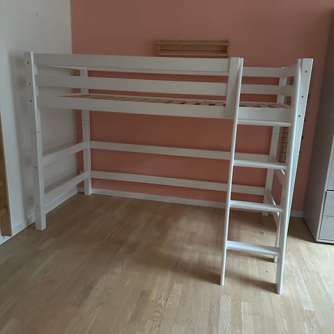 Praktisk køjeseng med plads til søskende eller overnattende gæster. Udvendige mål: B: 208 x H: 145 x D: 98 cm. Stigen kan placeres både i venstre og højre side. Nederste seng kan også med fordel bruges som legeområde, og med forhænget bliver det til en hyggelig hule.
