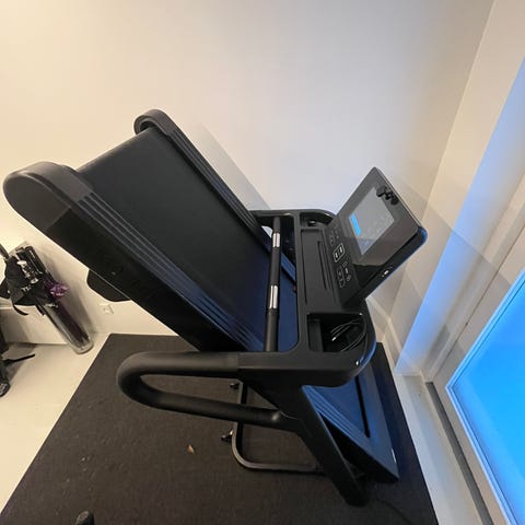 T77 EDGE er foldbart og kan let flyttes takket være transporthjulene. I sammenklappet tilstand måler det 130 × 83 × 141 cm – ideelt til hjem, hvor pladsen er begrænset.