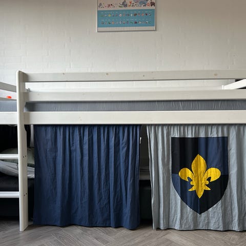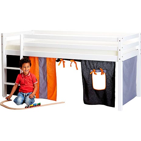 Spiloppe halvhøj seng med lamelbund, stige, rutsjebane, madras og forhæng.