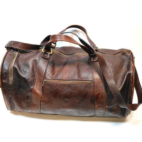 The Bridge vintage rejsetaske til mænd af brunt læder med robuste håndtag, justerbar skulderrem, to ydre sidelommer, mål 40 cm høj × 56 cm bred × 20 cm dyb, i god stand med mindre brugsspor. Klik på den blå "gå til varen" knap, for at købe eller byde på denne vare. Den samlede pris vil blive vist inden du afgiver dit bud.