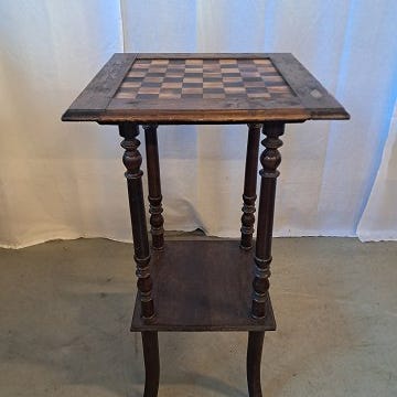 Bord lavet af finer i valnøddetræ og beriget med indlæg i ahorn og andre træsorter, har en kvadratisk overflade med et centralt skakbræt og en snoet ben, støttet af tre formede fødder. Fra 1900-tallet. Det fremstår i god stand, og det er vigtigt at se nøje på billederne, da de er en integreret del af beskrivelsen.