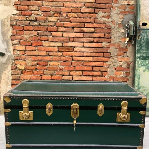 Bænk af rejse, lavet i Italien i perfekt modernariato-stil, i smaragdgrøn farve med låse, alle funktionelle med nøgle. Den har en lås i midten med en hængelås, der kan lukkes lufttæt, med mulighed for lås. Interiøret er i originalt papir, robuste håndtag på siderne, kompakt og let at transportere. Velegnet som garderobe, opbevaringsboks eller som show-room, hotel- eller udstillingsbænk. Sporing og forsikret forsendelse med dobbelt tilpasset emballage inkluderet i fragtprisen. Faktiske mål: 80x52x51 cm. Emballage: 100x60x60 cm.