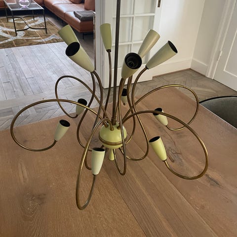 Et værk af lyrisk overflod af Antonio Piva, denne bemærkelsesværdige gulvlampe rejser sig som et lille stykke teaterbotanik: en elegant flamingo, gengivet i lost-wax støbt messing med en subtil rosé-opalinsk krop, står midt i en klynge af høje, buede stængler, kronet med tre store lotusbladsskærme. Hvert blad er omhyggeligt håndbanket og kantet med guld, deres skulpturelle kurve fanger lyset med en stille, gylden ånd.