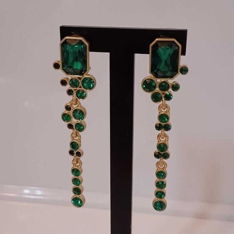 Halskæde signeret Oscar de la Renta, fremstillet i USA, grønne krystaller i forskellige former, forgyldt, unisex, længde 42 cm med 6 cm forlængelse, bredde 1,6 cm, vægt 104 g, nyt, afsendes i gaveæske. Klik på den blå "gå til varen" knap, for at købe eller byde på denne vare. Den samlede pris vil blive vist inden du afgiver dit bud.
