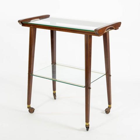 Elegant italiensk servicevogn fra midten af det tyvende århundrede, fremstillet med en struktur i messing og to gennemsigtige glasplader. Genstanden skiller sig ud ved sin enkle og geometriske linje, typisk for italiensk design fra 1950'erne, en periode hvor funktionalitet og formmæssig raffinement finder en særlig vellykket balance.