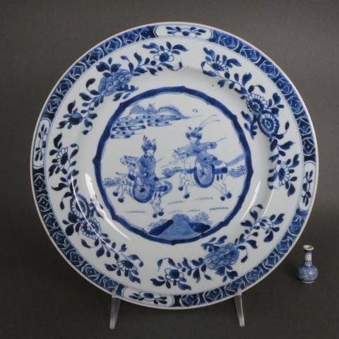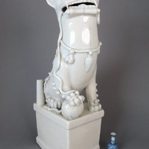 En smuk, tyktpottet og stor antik kinesisk porcelænsaske, udført med en flot malet dekoration af et majestætisk malet bjerg- og flodlandskab, med tænksomme lærde, huse udført i underglasblå og dækket af en tyk glasur. De tre fødder er dekoreret med Foo-løves hoveder. Håndlavet i det gamle kejserlige Kina, Dehua-provinsen, under Qing-dynastiet, Kangxi-periode, 17. århundrede. Garanteret originalt og fra den angivne periode. Meget sjælden, vi har aldrig set en, der er malet så flot som denne.
