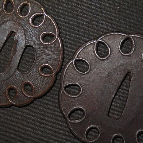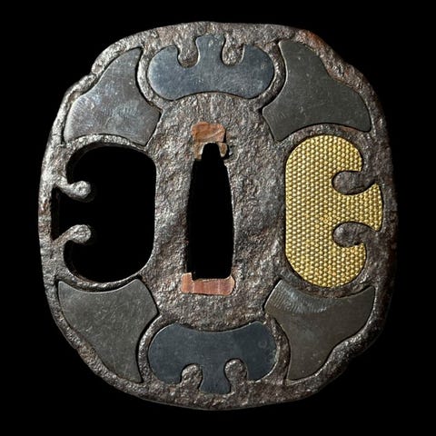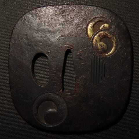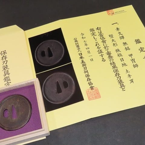 Gammel jern wakizashi-tsuba fra Edo-perioden i Japan, signeret Kaneshige, med motiv af en eremit/ munk, kran- og fyrretråddesign; dimensioner 6,6 x 6,6 x 0,5 cm, vægt 88 g, i god stand med alders- og slidmærker samt rust, med tomobako. Klik på den blå "gå til varen" knap, for at købe eller byde på denne vare. Den samlede pris vil blive vist inden du afgiver dit bud.