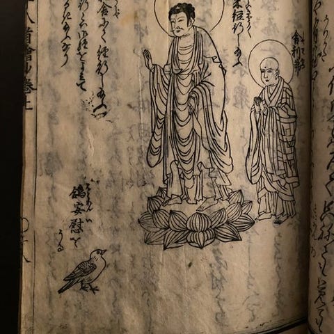 Original japansk tryk fra Edo-perioden (det 19. århundrede), fra den religiøse serie Kannon Reigenki. Flerfarvet træsnit (nishiki-e), der illustrerer et narrativt afsnit af Kannon-kulten, som blander hellig landskab, menneskelige figurer og forklarende tekst.