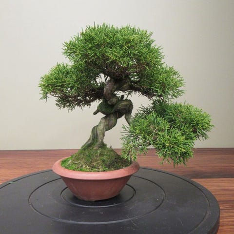 Elegant japansk bonsai af Juniperus procumbens til salg, formet i semi-cascade-stil (Han-Kengai) med et naturligt udseende, afbalanceret krone og modent stamme.