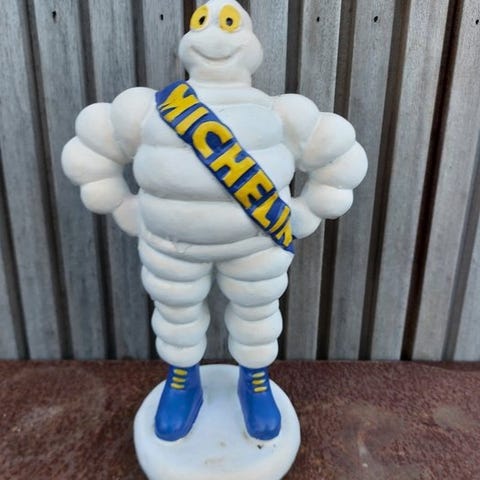 Den rundede hvide tegneseriefigur er Michelin-logo-figuren, 'Bibendum'. Den har en blå rem båret over kroppen, trykt med 'MICHELIN' og en lille figur.