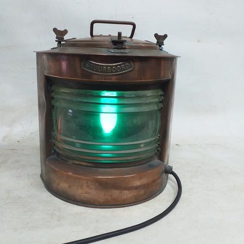 En meget smuk skibslygte i rød og gul kobber, denne fungerer med ny fatning, ledning og pære. Glasset er helt. Det er et toplys, der tidligere blev brugt på skibe, nu smukt til hjemmet som dekoration og skinnende, og billederne taler for sig selv.