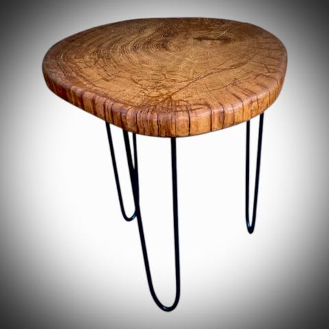 Vi præsenterer et unikt sofabord, omhyggeligt fremstillet af en tværsnitssektion af ægte massiv bøgetræ, støttet af elegante stålegs. Bordet har en samlet højde på 58 cm og en overfladestørrelse på 45 x 44 cm. Det hviler på tre metalben, som hver er pulverlakeret i en elegant sort farve.