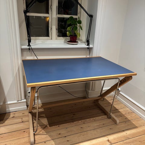 Målene på træarbejdsbordet er 50,5x35 cm. Et virkelig unikt og velbevaret