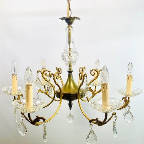 Antik fransk guldlignende kobberkronelygte med 3 arme og 4 lysesteder, Louis XVI-stil, omkring 1910–1920, rigeligt dekoreret med guirlander, glasblommekrukker, 4 fatninger, mål 60 × 60 × 92 cm, vægt 7 kg, ledninger helt fornyet. Klik på den blå "gå til varen" knap, for at købe eller byde på denne vare. Den samlede pris vil blive vist inden du afgiver dit bud.