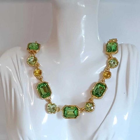 Signeret Oscar de la Renta ørestikker i forgyldt plating med grønne krystaller, længde 7,80 cm, bredde 1,80 cm, vægt 12 g pr. ørestik, i ubrugt stand. Klik på den blå "gå til varen" knap, for at købe eller byde på denne vare. Den samlede pris vil blive vist inden du afgiver dit bud.