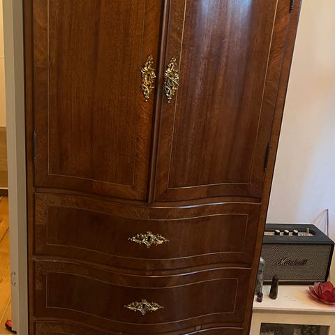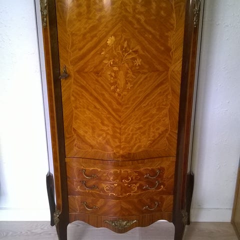 Skabet skiller sig ud med sit raffinerede arkitektoniske design, rillede detaljer, tapper ben og imponerende bronze-dekorationer, der skildrer klassiske og mytologiske motiver.