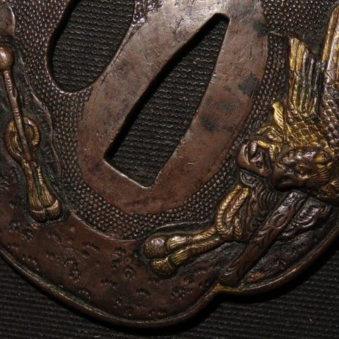 Tsuba Kansukashi fra Edo-perioden af Myochin med jern bagside, uunderskrevet, NBTHK-certificeret, 65 mm lang og 78 g, i god stand. Klik på den blå "gå til varen" knap, for at købe eller byde på denne vare. Den samlede pris vil blive vist inden du afgiver dit bud.