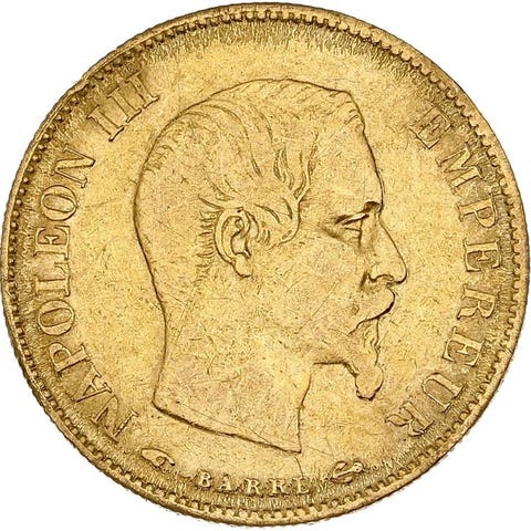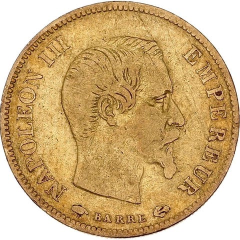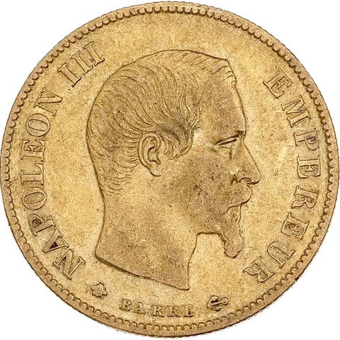 Guldmønt på 10 francs, 1859 A Napoléon Tête nue, vægt 3,22 g, fineness .900, oprindelse Frankrig. Klik på den blå "gå til varen" knap, for at købe eller byde på denne vare. Den samlede pris vil blive vist inden du afgiver dit bud.