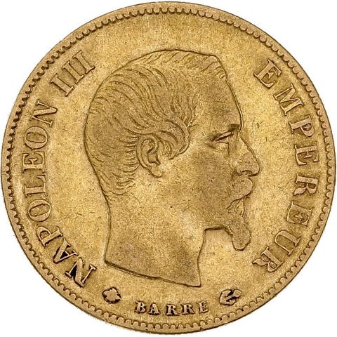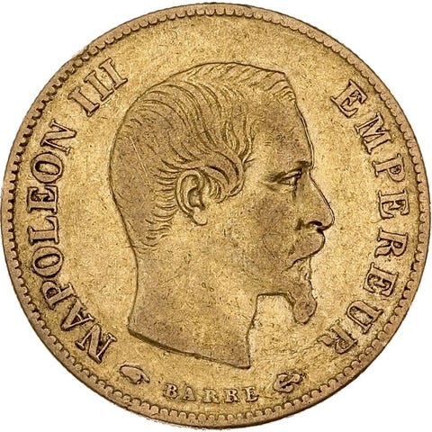 Guldmønt, samlet vægt 3,22 g, legering 0,900, præget 10 Francs 1856 A Napoléon Tête nue, Frankrig. Klik på den blå "gå til varen" knap, for at købe eller byde på denne vare. Den samlede pris vil blive vist inden du afgiver dit bud.