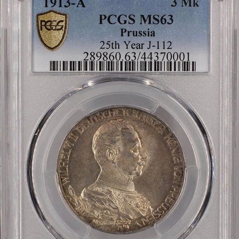 Tyskland, Preussen, 1901 commemorativ 2 Mark mønt med Friedrich I og Wilhelm II på framsiden og Det tyske riges ørn på bagsiden; vurderet MS63 af NGC. Klik på den blå "gå til varen" knap, for at købe eller byde på denne vare. Den samlede pris vil blive vist inden du afgiver dit bud.