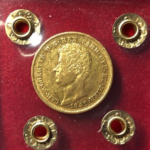 Sabaudisk skjold med krone, med den hængende orden af den Helligste Annoncering, mellem to laurbærgrene bundet nederst med bånd. I signaturen, R L • 20.