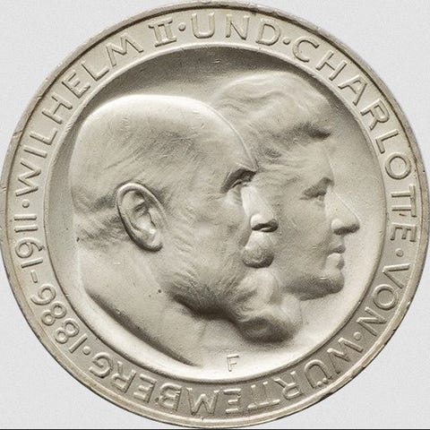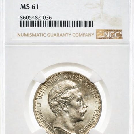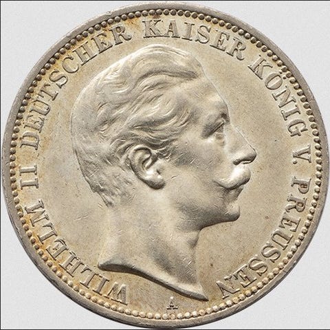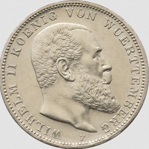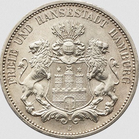 Emissionsmønter fra Weimar-republikken præget i sølv, med et sober og kraftfuldt design, der er typisk for perioden med monetær stabilisering efter hyperinflationen. Forsiden viser værdien DREI MARK og året 1924 omgivet af legendet DEUTSCHES REICH, med en tydelig prægning af punktlinjer. Bagsiden viser en stiliseret tysk ørn med udstrakte vinger, uden krone eller dynastiske skjolde, symbol på den nye republikanske stat. Mønten har en tiltalende sølvfarve med en let ensartet patina, gode reliefs i fjer og legendes, og en meget afbalanceret