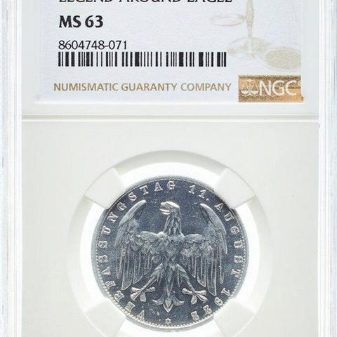 Et sølv 3-mark-mynt fra Berlin, Weimarrepublikken, præget i 1924 og uden cirkulation. Klik på den blå "gå til varen" knap, for at købe eller byde på denne vare. Den samlede pris vil blive vist inden du afgiver dit bud.