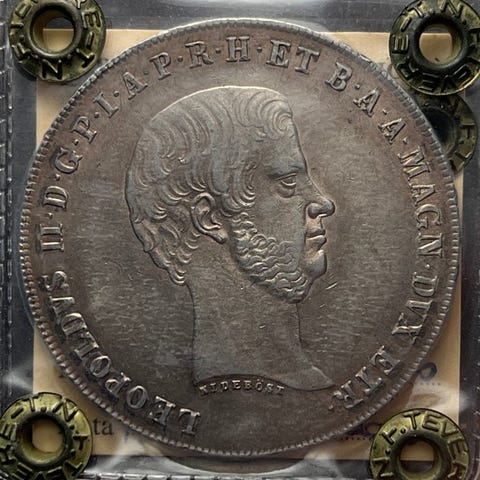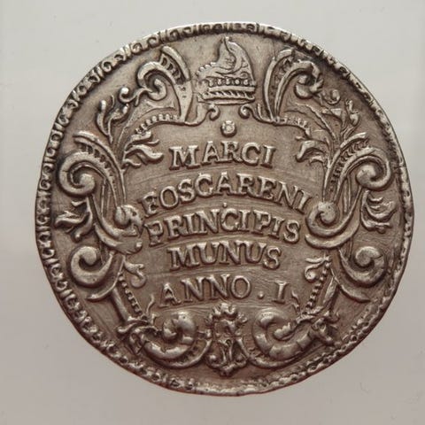 Rovescio: forklaring og dato i fem linjer, inden for en udsmykket mappe.