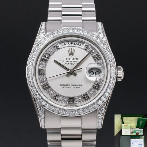 Denne Rolex Day-Date 18346 har en sølv myriad diamant romersk urskive og er lavet af platinum, med produktionsår 1993.