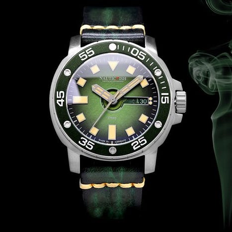 NauticFish Thûsunt - Den nye generation. Det gammelhøjtyske ord thûsunt (tusind) står for den enestående pålidelighed og vandmodstand på over 1000 meter i den nye NauticFish-generations. Målet var at skabe en balance mellem høj pålidelighed, moderne funktionalitet og retro-inspireret design. Thûsunt er ikke udviklet til det brede marked, da vi ser serien som en specialitet blandt dykkerure. Urskiven imponerer med sin usædvanlige brugt-stil farvesekvens, og det pudeformede urkasse med dimensionerne 43x43 mm sikrer en fremragende komfort ved bæring. Den fremragende læsbarhed sikres af det konvekse lup-safirglas med en forstørrelsesfaktor på ca. 1,3. Yderligere tekniske højdepunkter som den automatiske heliumventil med PVD-belægning og kronelåsesystemet fuldender Thûsunt's ydeevne.