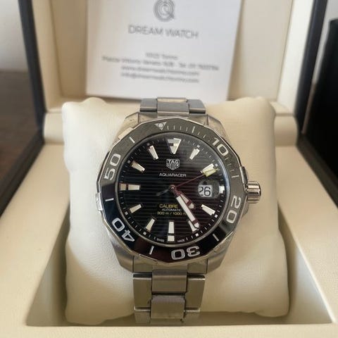 TAG Heuer Aquaracer 300M Calibre 5, reference WAY208C.FC6383, automatisk bevægelse, titanium kasse 43 mm, original urskive, tekstilrem, fuldt sæt med æske og papirer, år 2022, ubrugt tilstand. Klik på den blå "gå til varen" knap, for at købe eller byde på denne vare. Den samlede pris vil blive vist inden du afgiver dit bud.