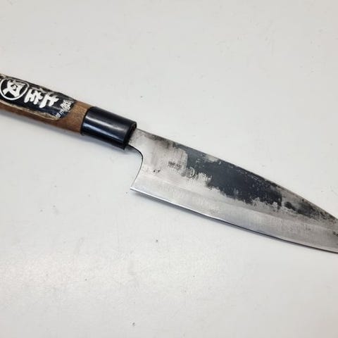 Kniven er i god stand og skarp, med et smukt, gennembrugt blad, der vidner om mange års omhyggelig brug. Den naturlige patina på stålet understreger det professionelle præg og giver kniven et tiltalende, autentisk udseende uden at gå på kompromis med funktionaliteten.
